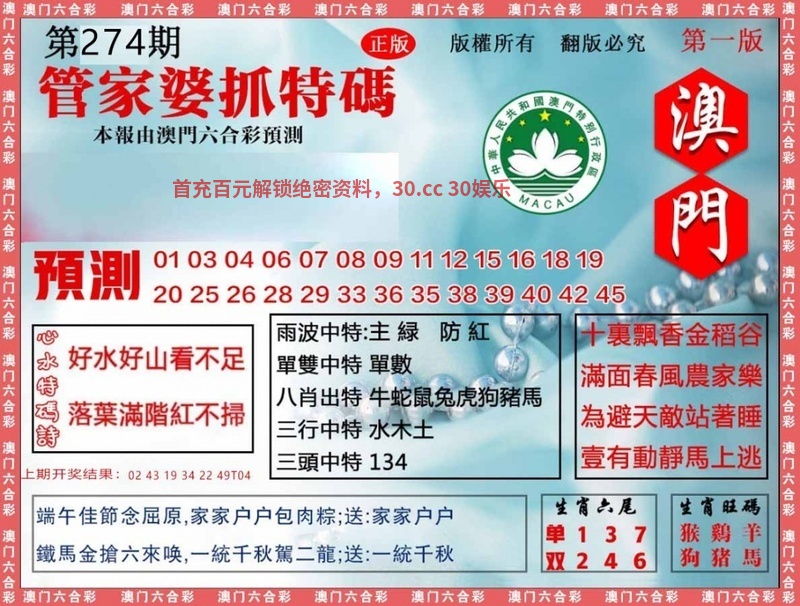 274期:九肖18码※开:狗44准 | ||